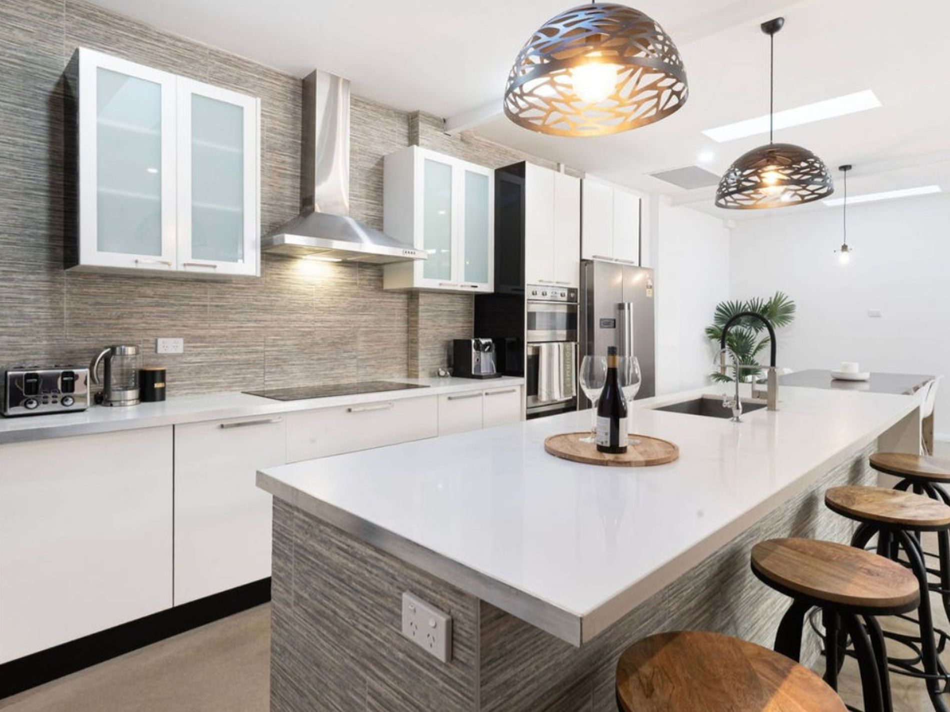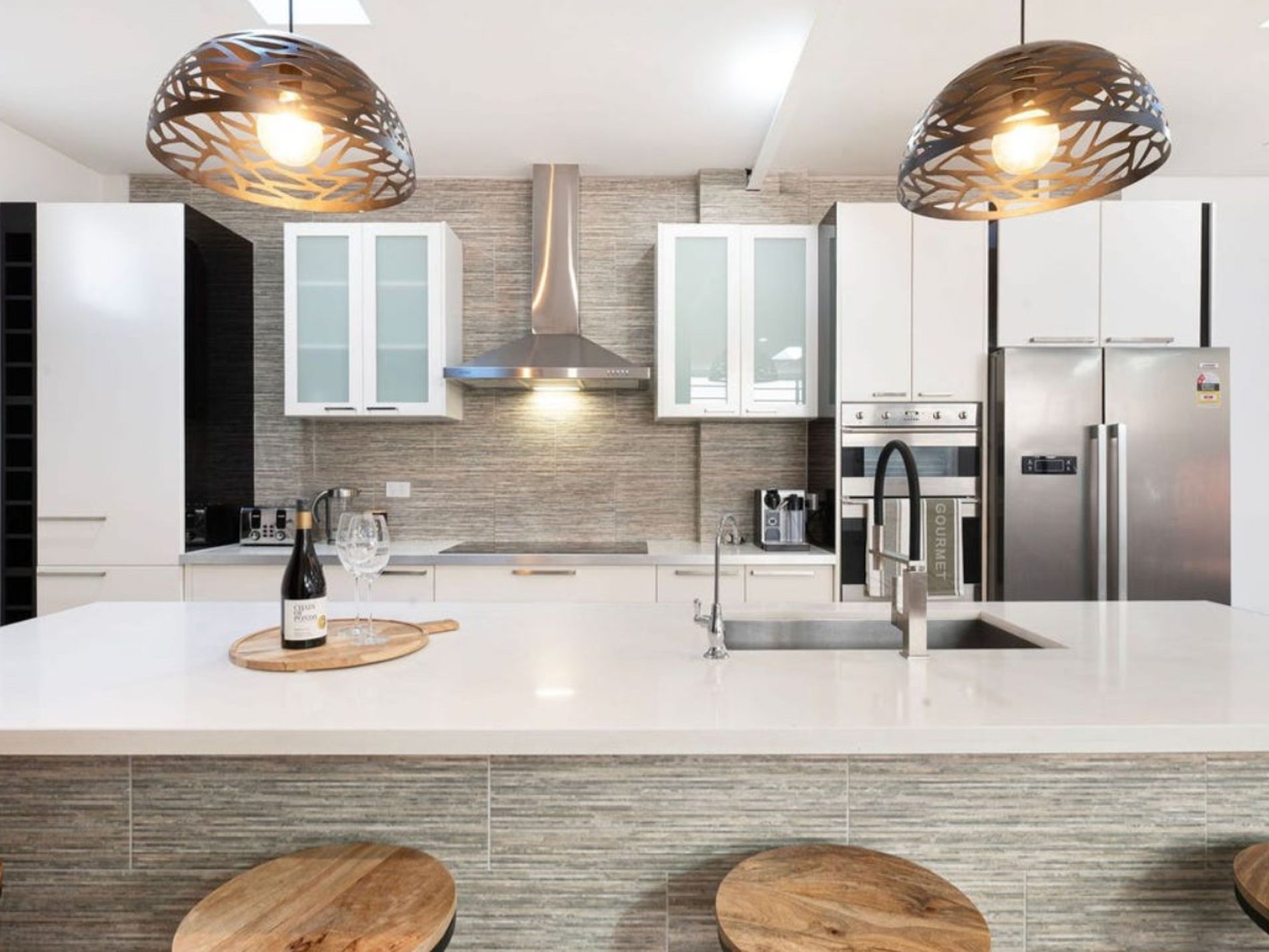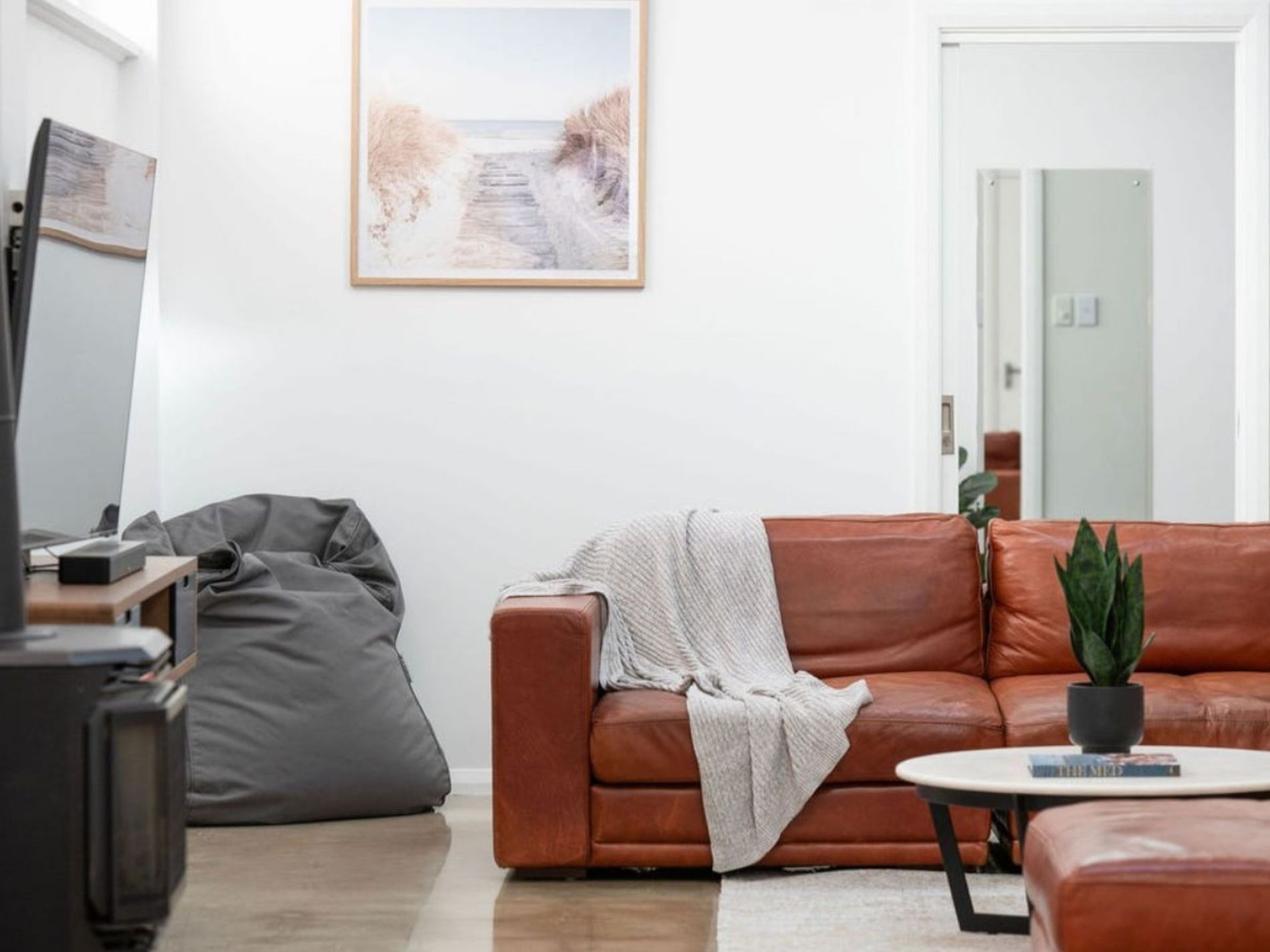 Enjoy the open-plan living area with a leather sofa, large-screen TV, and cozy gas fireplace. The fully equipped kitchen boasts stone benchtops, stainless steel appliances, ducted air conditioning, a Nespresso coffee machine, and all the essentials.